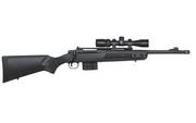 Mossberg's MVP Scout features a Dual-Push bolt design that accepts and feeds both M1A and AR10 style magazines. The 16.25" medium bull barrel is threaded with removable A2-style flash suppressor (thread cap provided), and the front fiber optic sight is paired with a rail-mounted ghost ring rear sight. It has a standard Mossberg LBA Adjustable trigger, oversized tactical bolt handle, pillar-bedded stock, and 11" Picatinny rail with two side-mounted rails. This scoped combo includes a Vortex Crossfire II Scout Scope and sling.