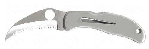 Like the claw of the Harpy eagle the C08 is shaped for controlled pulling cuts. The hawkbill blade shape originated in the marine/fishing industry where severing rope, line, webbing and netting is done at arm's length quickly and efficiently. The curving arc holds what you're cutting against the sharpened edge keeping it from slipping off the tip. Custom knifemaker David Boye developed the dent in the locking lever, which insures the blade remains securely locked open when gripping the handle with force. Cut out of the handle is a shackle key/drying vent allowing air to circulate around the blade when closed wet. Metal clip is positioned for tip down carry.